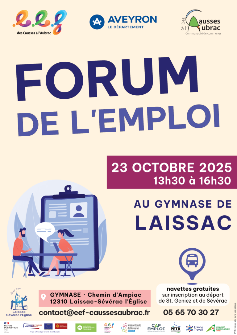 Venez à la rencontre du monde professionnel et avec votre CV à l’occasion d’une nouvelle édition du Forum de l’emploi qui se tiendra le jeudi 23 octobre au gymnase de Laissac, de 13h30 à 16h30. Des navettes seront à disposition sur inscription, aux départs de St Géniez d’Olt et de Sévérac le Château. Se renseigner […]