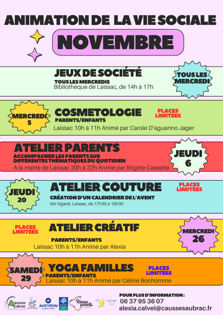 Programmation du mois de novembre. 🎉 Au programme : • Des temps ludique • Animations pour les familles des atelier créatifs pour les petits et les grands • Ateliers parents • Ateliers parent et enfant 📅 Quand ? Pour le mois de novembre 📍 Où ? Sur les communes de Laissac et Cruejouls Ces moments […]