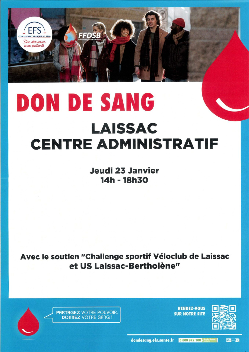 Prochain don du sang à Laissac, le jeudi 23 janvier de 14h à 18h30 au centre administratif.