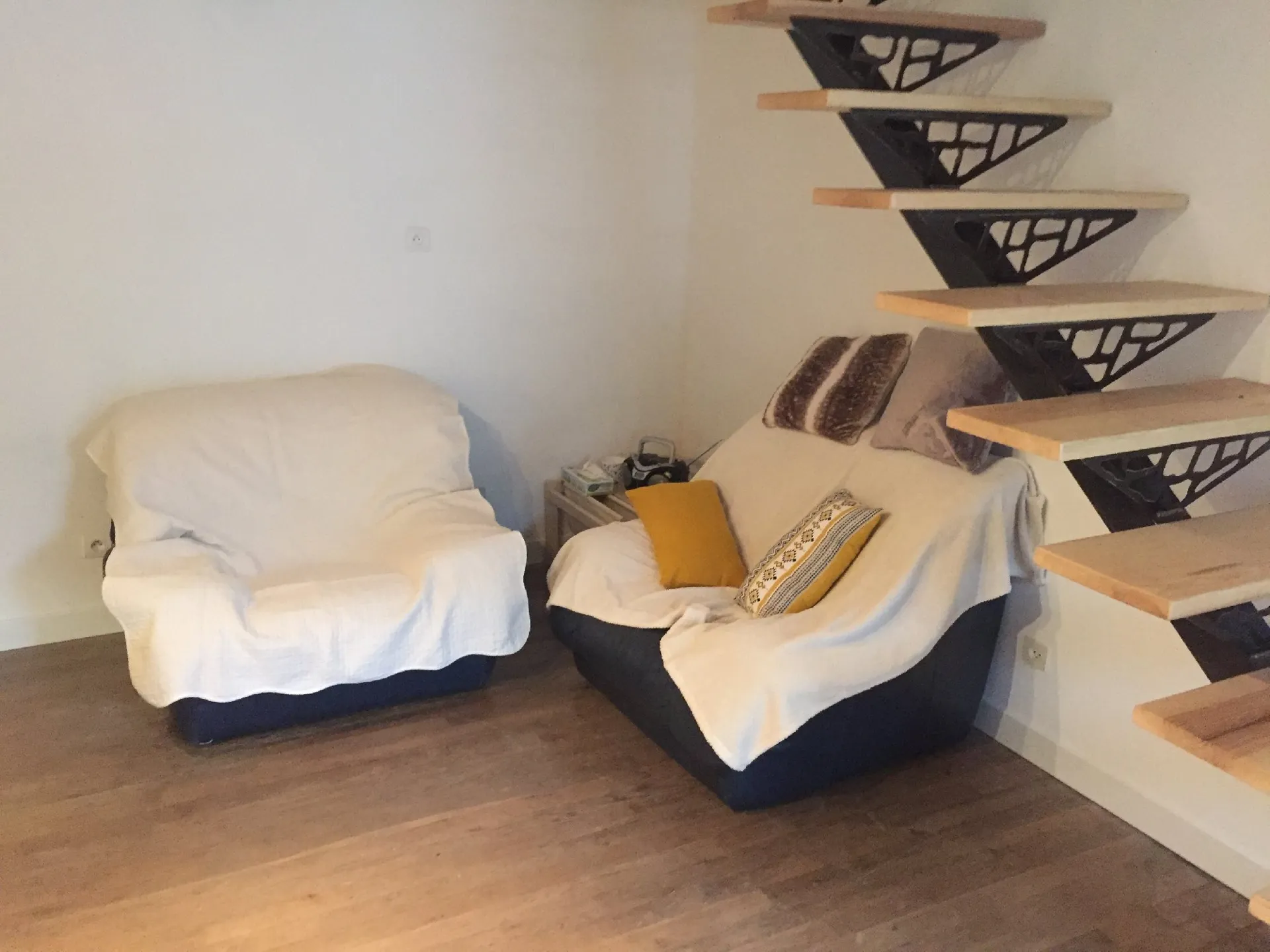 A l’étage: grande chambre avec 3 couchages (1 lit en 140 et 1 lit en 90), 1 salle d’eau et WC.